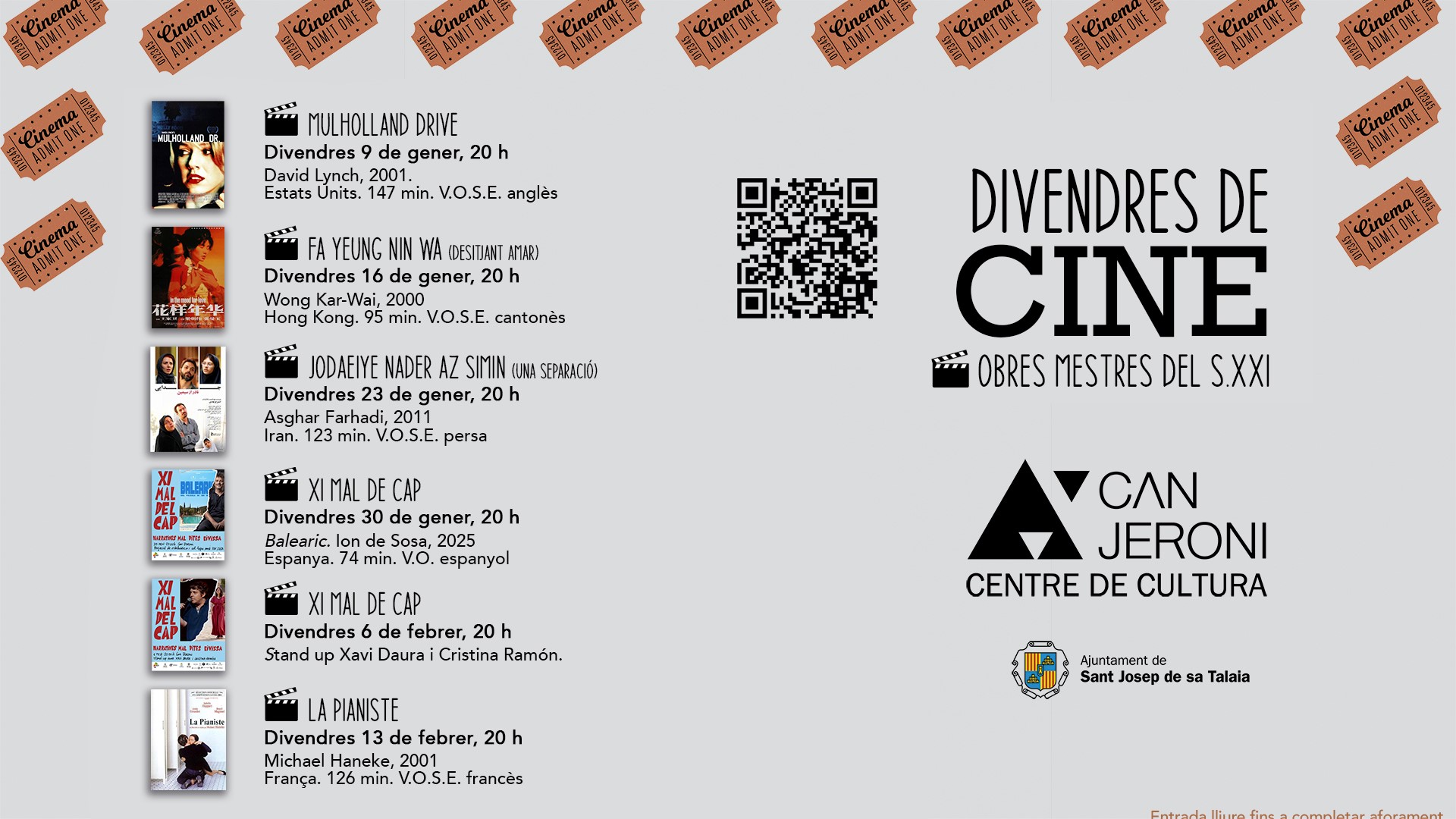 El ciclo arranca este viernes, 9 de enero, y ofrece proyecciones todos los viernes a las 20 horas en la sala de Can Jeroni, siempre en versión original subtitulada en castellano (VOSE).