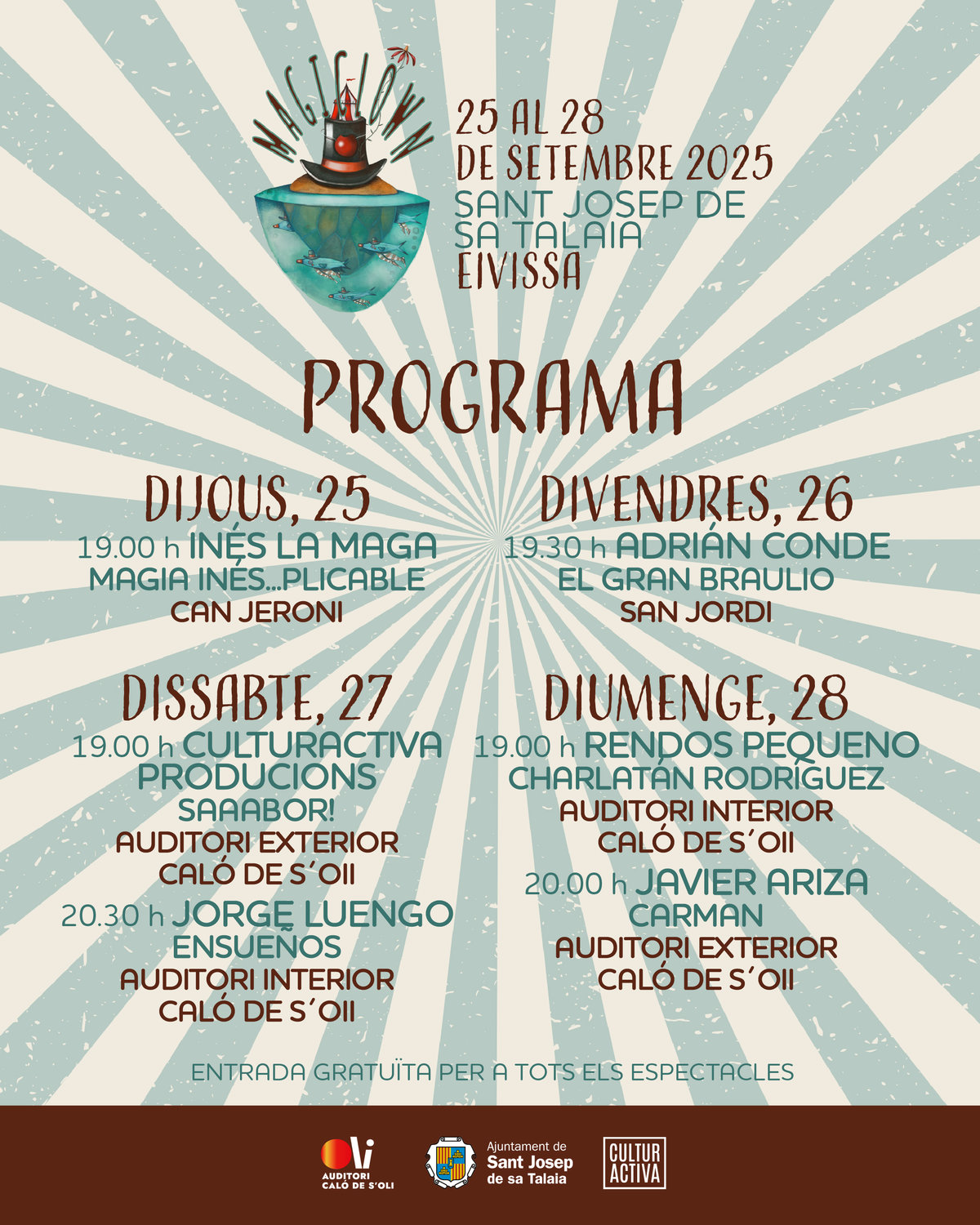 Durante el fin de semana, la programación se trasladará al Auditorio Caló de s’Oli. El sábado 27 de septiembre, el público disfrutará de una doble sesión. Por la mañana, en el espacio exterior, la compañía Culturactiva Produccions presentará Saaabor!, un cóctel lleno de ritmo, humor y participación del público en formato de teatro-circo culinario. Por la noche, el ilusionista Jorge Luengo, conocido por sus apariciones televisivas en El Hormiguero, presentará Ensueños, un espectáculo de gran formato donde la magia se fusiona con la narración para crear una experiencia única.