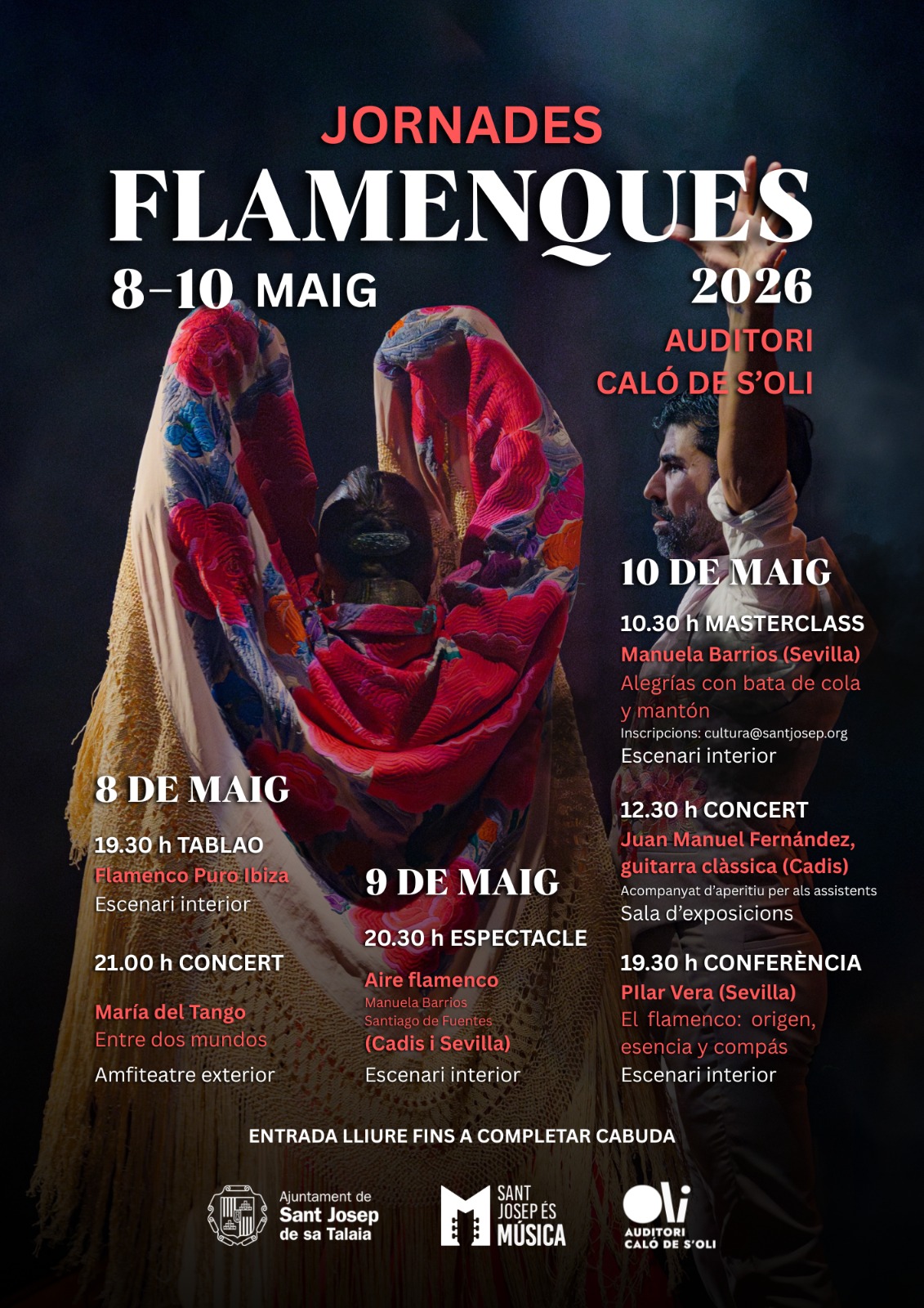 El Ayuntamiento de Sant Josep de sa Talaia ha presentado esta mañana la quinta edición de las Jornadas Flamencas, que se celebrarán en el Auditorio Caló de s’Oli entre el 8 y el 10 de mayo. Como es habitual, el programa incluye la participación de prestigiosos artistas del flamenco, como el bailaor Santiago Fuentes, la bailaora Manuela Barrios, el cantaor Jesús Castilla o el guitarrista Juan Manuel Fernández, que se encontrarán en el espectáculo Aire Flamenco junto a otros músicos, ofreciendo también masterclass y actuaciones en solitario en algunos casos. Además, actuarán la granadina María del Tango, una de las voces más singulares del flamenco contemporáneo, que llega con toda su banda para presentar su nuevo álbum, así como la formación Flamenco Puro Ibiza y la flamencóloga y cantaora sevillana Pilar Vera.