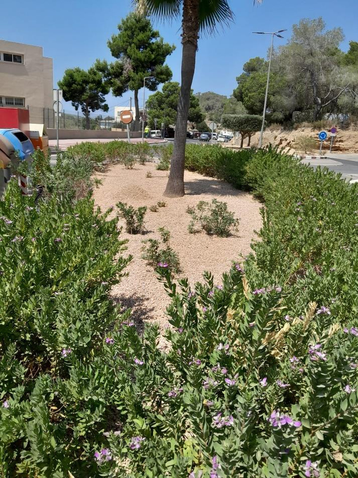 Las tareas, desarrolladas entre el 15 de julio y el 7 de septiembre, han incluido la eliminación manual de la piedra y de la malla antihierba existentes, la revisión y renovación de la red de riego, así como la instalación de una nueva malla antihierba cubierta con árido reciclado. También se ha procedido a la plantación de especies arbustivas mediterráneas, con un total de 246 ejemplares, que aportan color y vitalidad al entorno del centro.