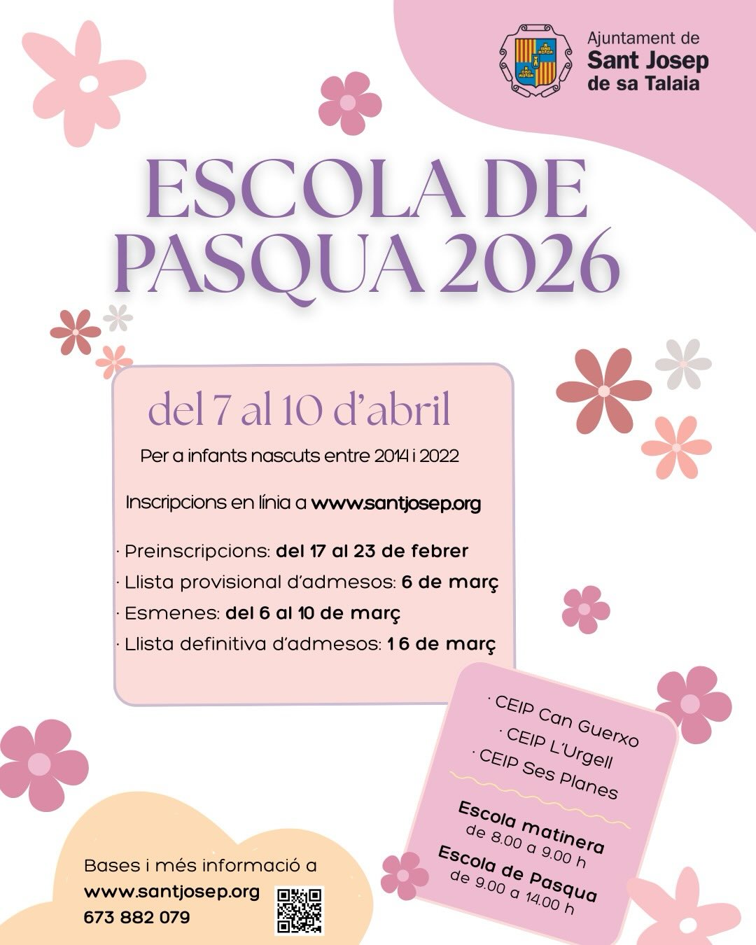 L’Ajuntament de Sant Josep de sa Talaia, a través de l’àrea de Joventut, ha presentat avui una nova edició de l’Escola de Pasqua 2026, un servei educatiu i lúdic adreçat a infants nascuts entre els anys 2014 i 2022, que es durà a terme del 7 al 10 d’abril de 2026.