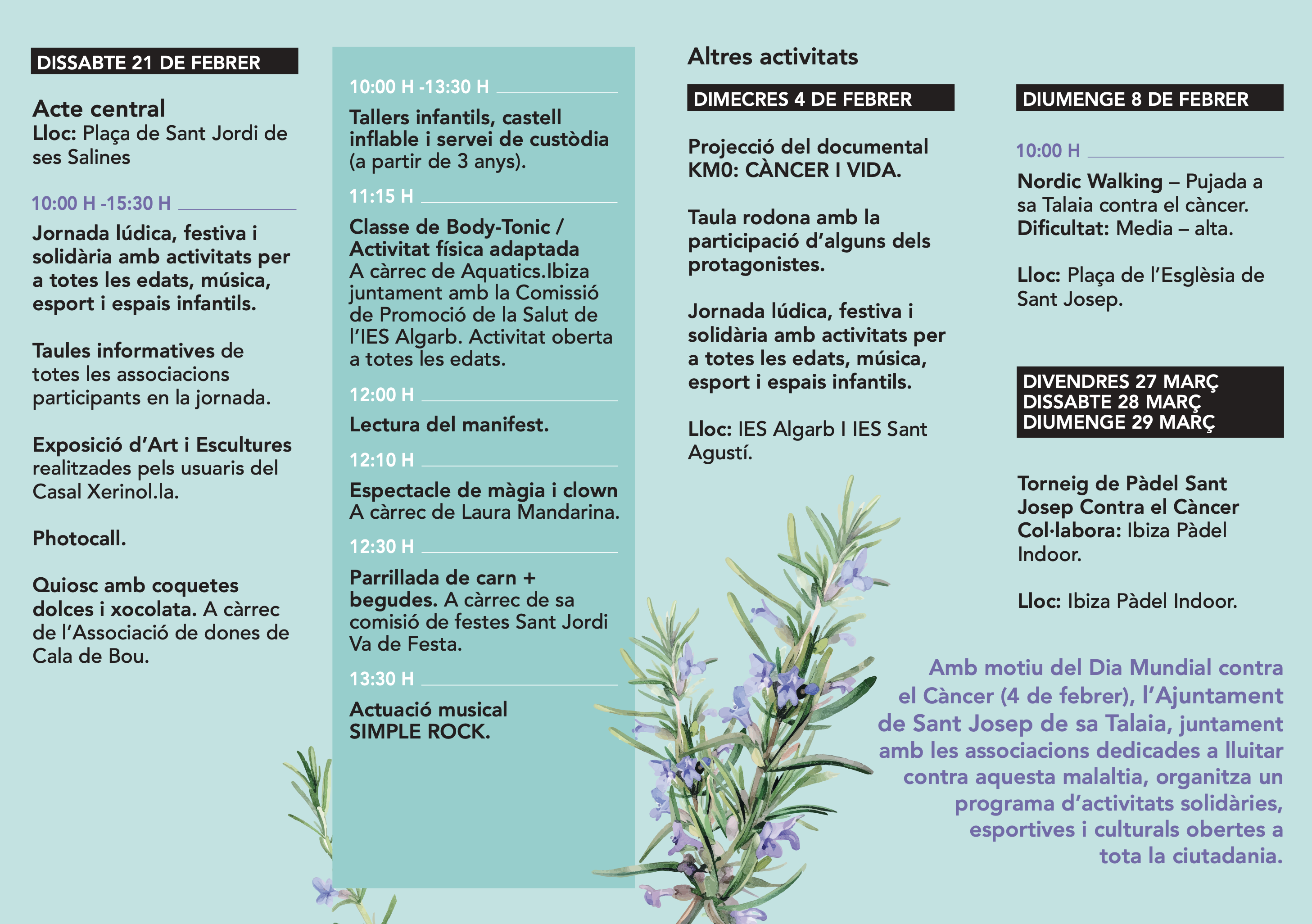 El programa es completarà amb altres activitats al llarg de les setmanes següents, com la projecció del documental ‘KM0: Càncer i vida’ i una taula rodona als instituts IES Algarb i IES Sant Agustí el 4 de febrer, la pujada solidària a sa Talaia mitjançant una activitat de Nordic Walking el 8 de febrer, i el Torneig de Pàdel Sant Josep contra el Càncer, que se celebrarà els dies 27, 28 i 29 de març a Ibiza Pàdel Indoor.